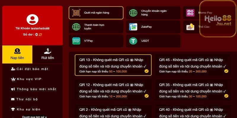 Hello88 hỗ trợ đa dạng phương thức thanh toán như chuyển khoản ngân hàng, ví điện tử, thẻ cào điện thoại…